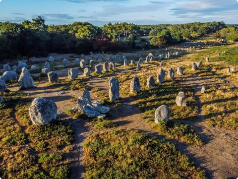 Situados en el sur de Morbihan, los megalitos de Carnac forman uno de los conjuntos prehistóricos más extraordinarios del mundo. Con más de 7.000 años de antigüedad, este paisaje de piedra —compuesto por miles de menhires, dólmenes y túmulos— ha sido inscrito como Patrimonio de la Humanidad por su inigualable valor arqueológico. Sus alineaciones, dispuestas con una precisión que aún despierta asombro, revelan la complejidad de una civilización que empleó estos monumentos con fines rituales y funerarios. Enigmático y magnético, Carnac se erige como un santuario de la memoria humana, comparable en misterio y espiritualidad con el célebre Stonehenge de Inglaterra.